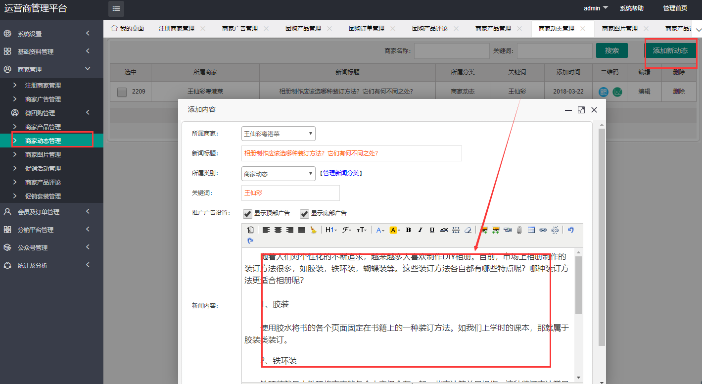 商家動態(tài)主要展示商家新聞內(nèi)容的,各個商家的動態(tài)詳情顯示在此列表,在添加動態(tài)前,需進行動態(tài)分類!也可由商家登錄商家管理后臺,進行新聞動態(tài)上傳。如下圖所示: