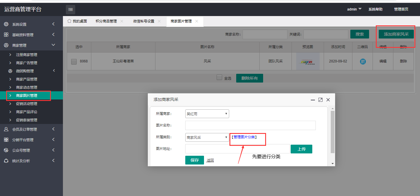 商家圖片管理顯示所有商家的商家相冊,添加前需要添加設(shè)置分類,設(shè)置分類后,再選擇對應(yīng)商家進行上傳商家相冊。也可由商家登錄商家管理后臺,進行圖片上傳。如下圖所示: