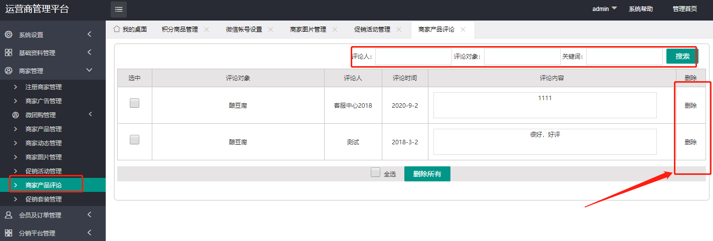 可在此管理所有團購產(chǎn)品的評論,并可根據(jù)關(guān)鍵詞、評論人、評論對象進行搜索查找;管理員亦可直接刪除某條評論;當(dāng)團購產(chǎn)品過期后,評論將不會顯示在這里。如下圖所示: