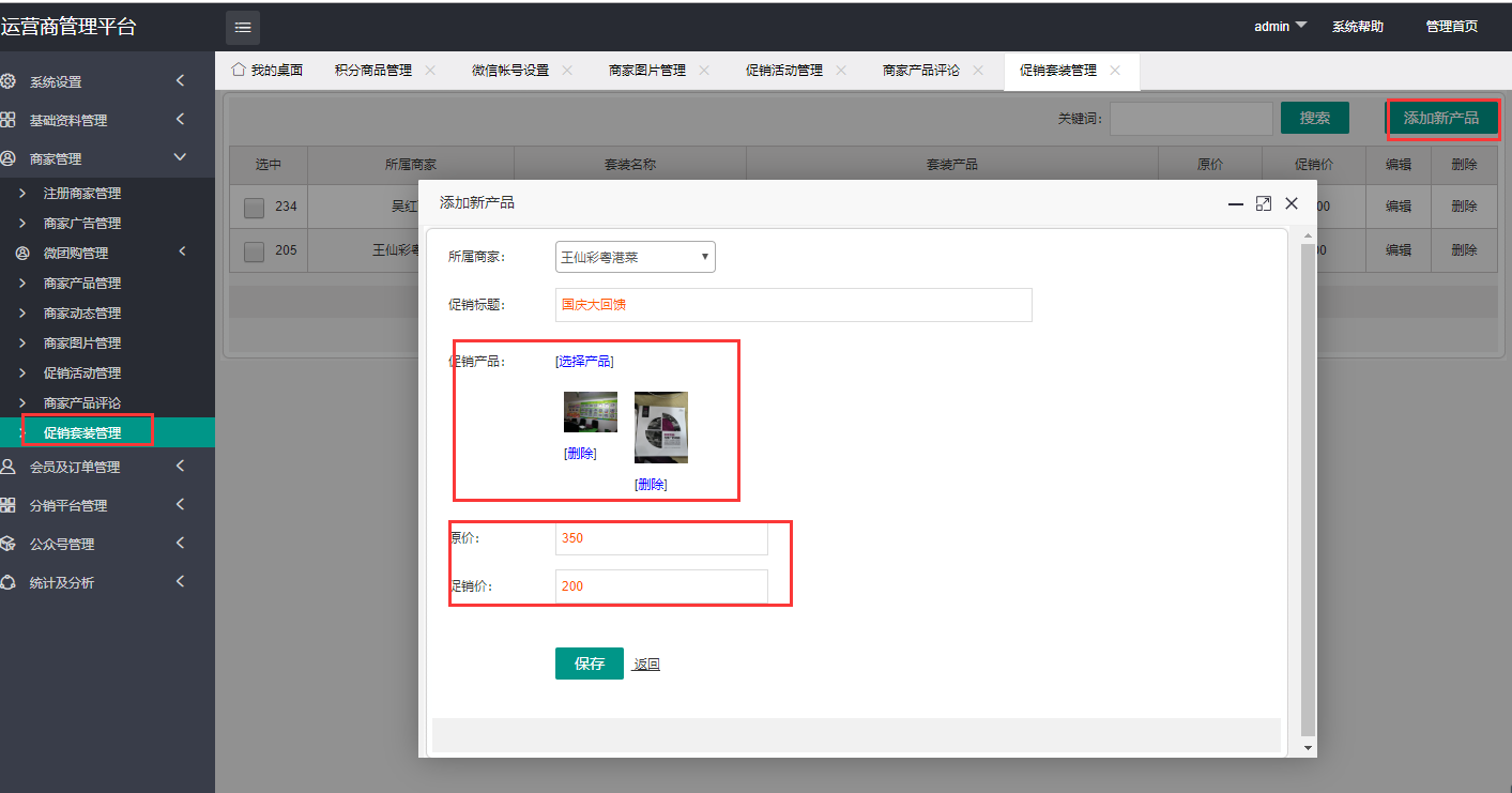 平臺運營商可選擇多個產(chǎn)品組合起來一起銷售,當(dāng)消費者看到A產(chǎn)品時,相關(guān)位置會推送和A組合起來的套餐優(yōu)惠價格,本來消費者只會買A,看到A和B的推送,2個都可以一起買。這里的可設(shè)置任意多個商家的多個產(chǎn)品組合在一起。只要這個產(chǎn)品有添加到促銷套裝里,那么就會顯示,同一個產(chǎn)品不限制參與的促銷套裝數(shù)。如下圖所示:
