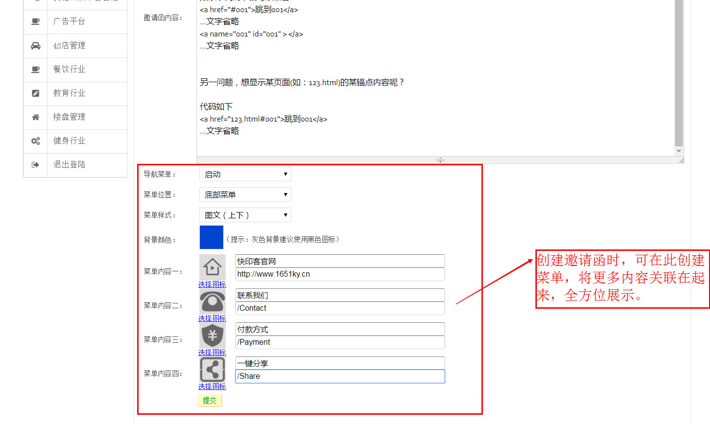 3、邀請函新增菜單功能。創建邀請函時,可通過創建底部菜單,將更多內容關聯起來,進行組團展示。