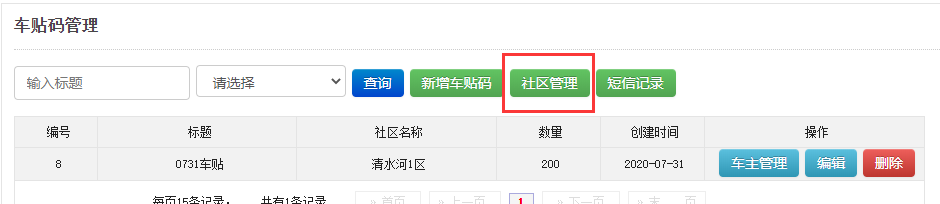 操作車貼碼之前,必須先初始化社區資料,點擊頁面頂部 社區管理 按扭,進入社區管理