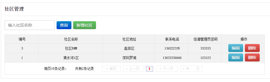 社區管理頁面 默認列表展示所有社區信息,管理員可在此添加、編輯、刪除相應的社區資料