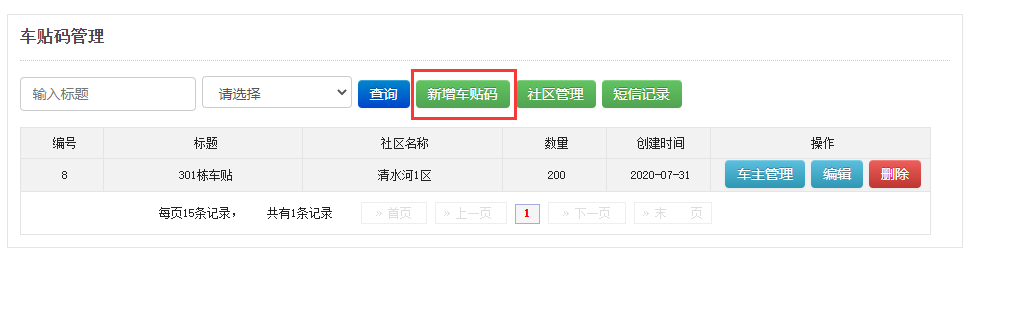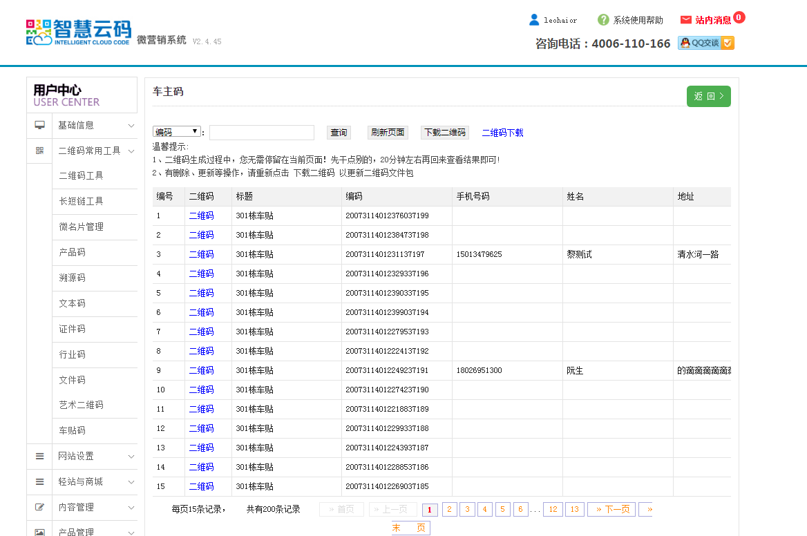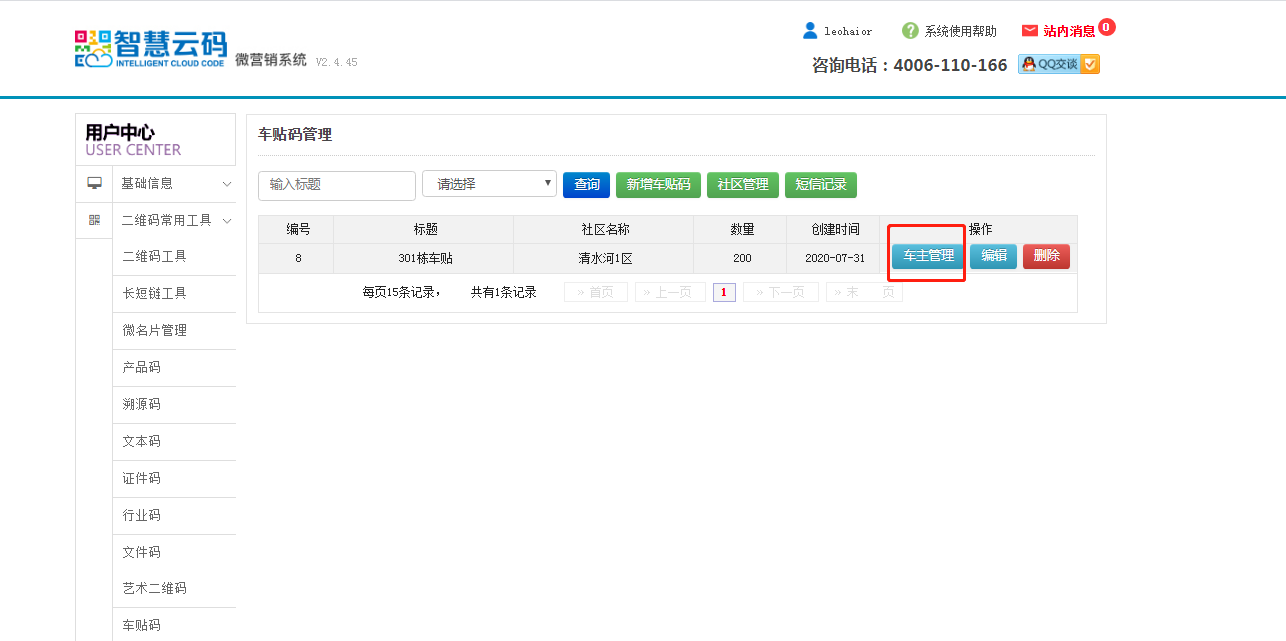 車主管理中生成車貼碼,支持車主屬性搜索,下載二維碼等操作