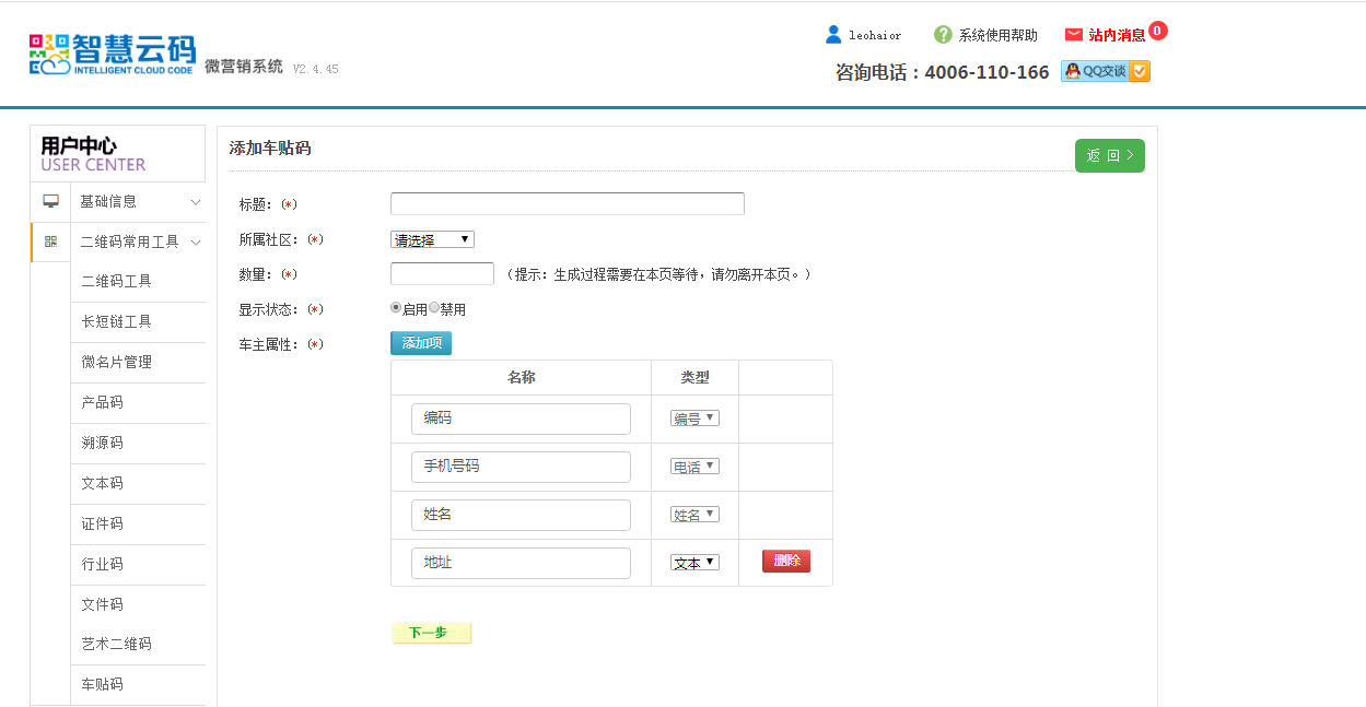 新增車貼碼輸入必填項,選擇所屬社區,按照不同的需求,添加車主屬性,車主屬性除了前三個,其他屬性可自定義增刪。