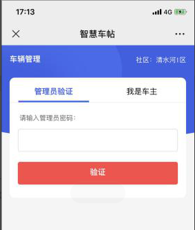 當已經完善資料的車貼碼被掃碼時,會顯示身份選擇界面,即選擇是車主 或者 社區管理員,以便進行功能區分: