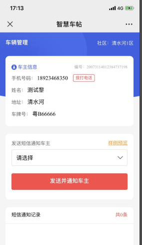 管理員可在短信庫中,選擇相應的短信模板,點擊 發送并通知車主,即完成短信通知程序。