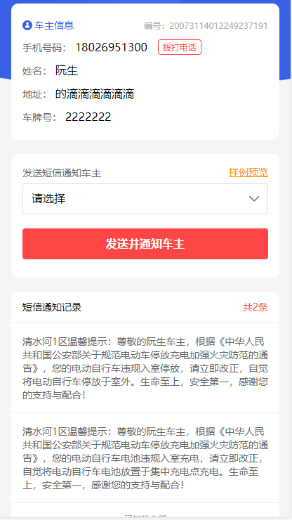 管理員可在此查看車主及車輛信息,撥打車主電話號碼,及發送違停短信給車主。同時,該頁面也會顯示該車輛過往的短信發送歷史記錄