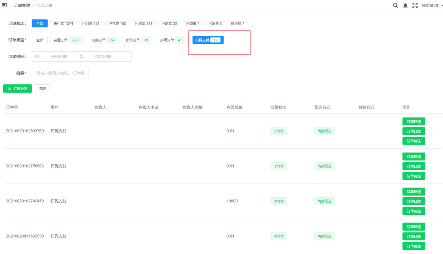 登陸微商城后臺,打開 訂單管理>>全部訂單,在訂單類型中,選擇 “掃碼支付”類型,即可查看及管理所有靜態付款訂單: