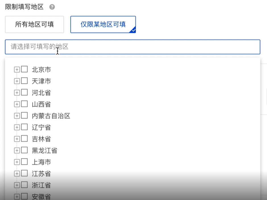4、增加 限制填寫地區 及 限填地區提示 功能,允許用戶設置哪些地區可以填寫此表單(以城市為單位即可,允許添加全國 或者 選擇城市),如圖: