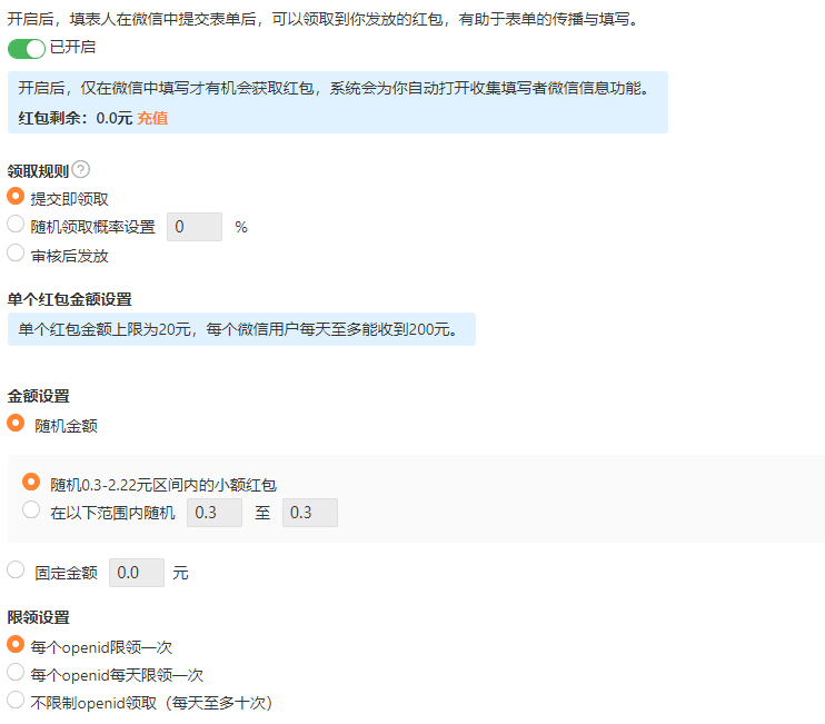 6、增加紅包功能。開啟后,填表人在微信中提交表單后,可以領取到你發放的紅包,有助于表單的傳播與填寫。如圖:
