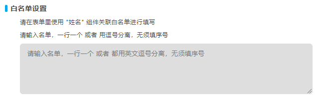 8、姓名組件,增加白名單功能,管理員在創建表單時,可預設白名單,用戶在填表時,則只有白名單中的姓名可填,同時,管理員在后臺,可隨時查看填寫人員信息。如圖: