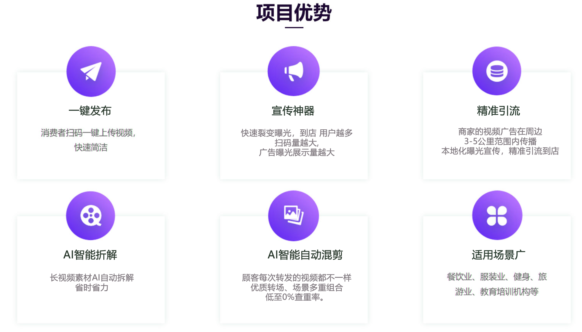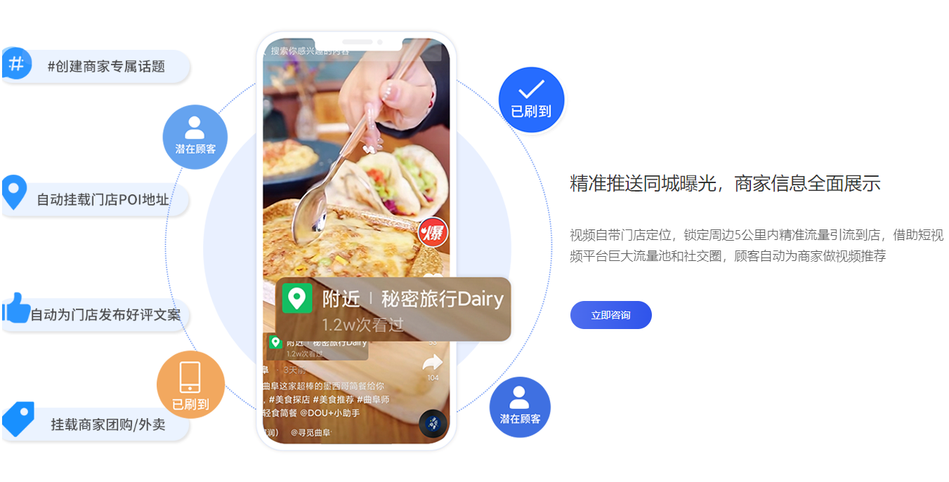 解決商家短視頻獲客成本過高,質量差等的難題;達到精準拓客、轉化復購等目的,讓商戶店鋪流量無限放大。